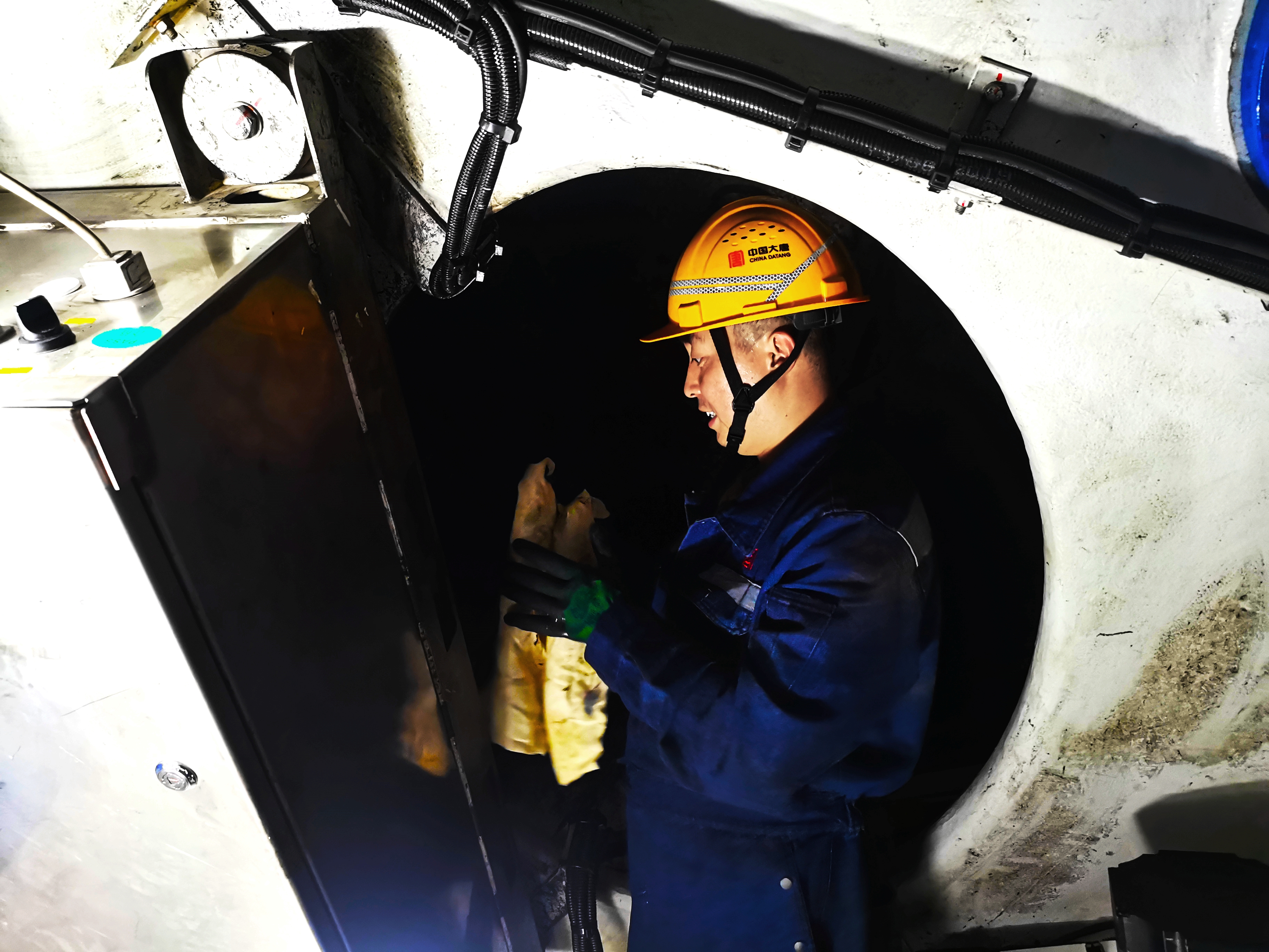 张世杰和靳博杰爬上风机,钻进狭小的轮毂中,开始排查故障点,刺骨的寒风透过厚厚的连体服直达骨髓。他们的手都被冻得通红,关节僵硬,搓搓手、哈口气后,又投入到故障排查中。