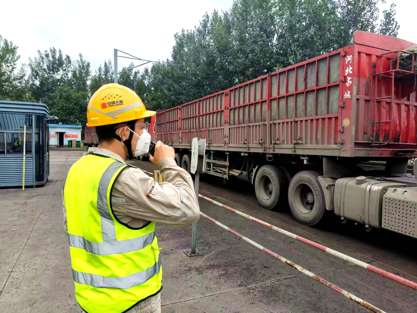老王的指令通过对讲机传来,随即转向引导下一辆运煤车:“师傅,请刷卡,准备过磅。”他穿梭于车辆之间,既要保畅通,又指导司机配合机械采样。