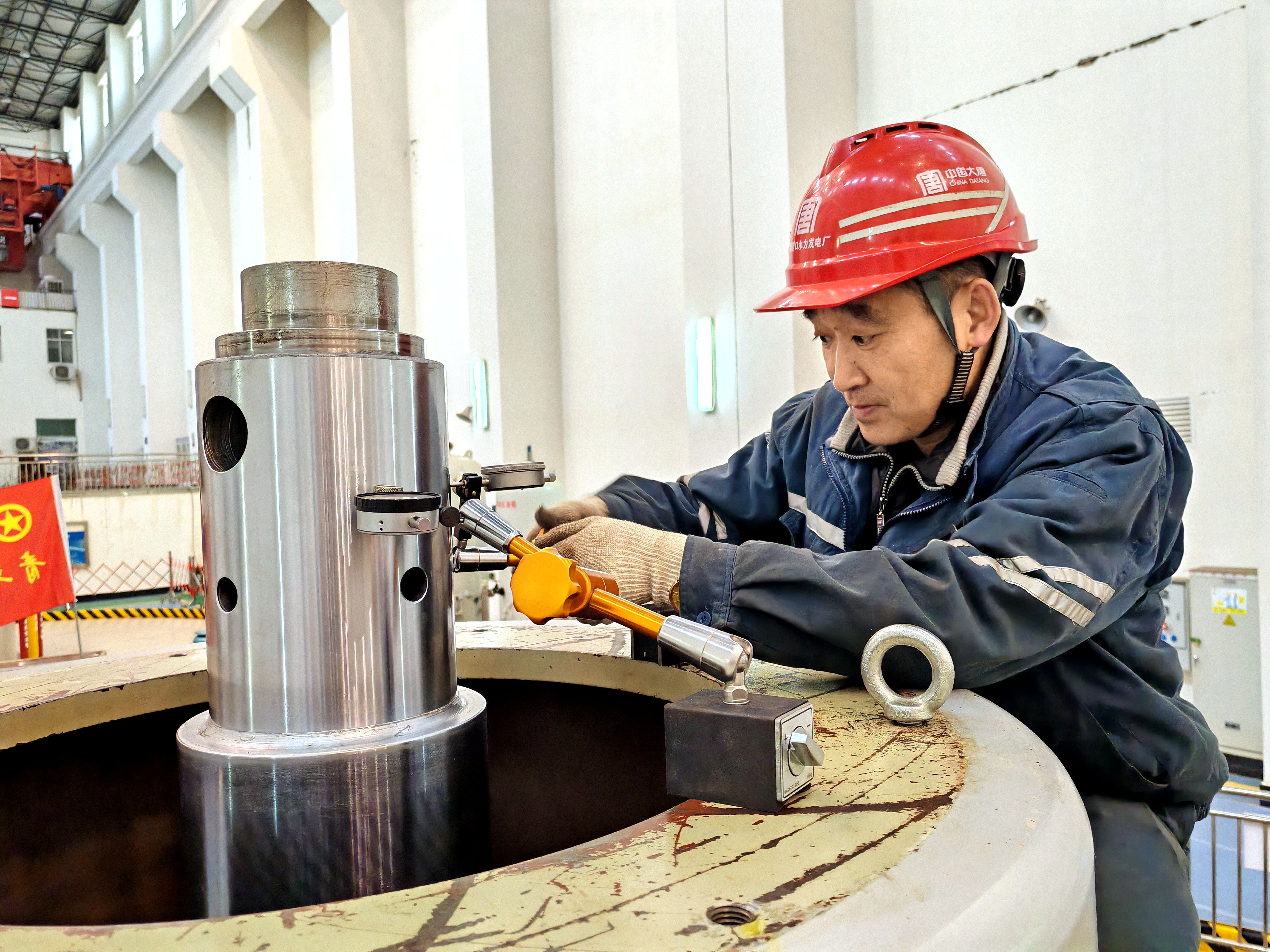 碧口水电厂麒麟寺水电站3号机A修现场,机械负责人李家勇下达盘车指令。随着盘车装置启动,机组大轴缓慢转动起来,机组各部位检测工作紧张、有序开始。