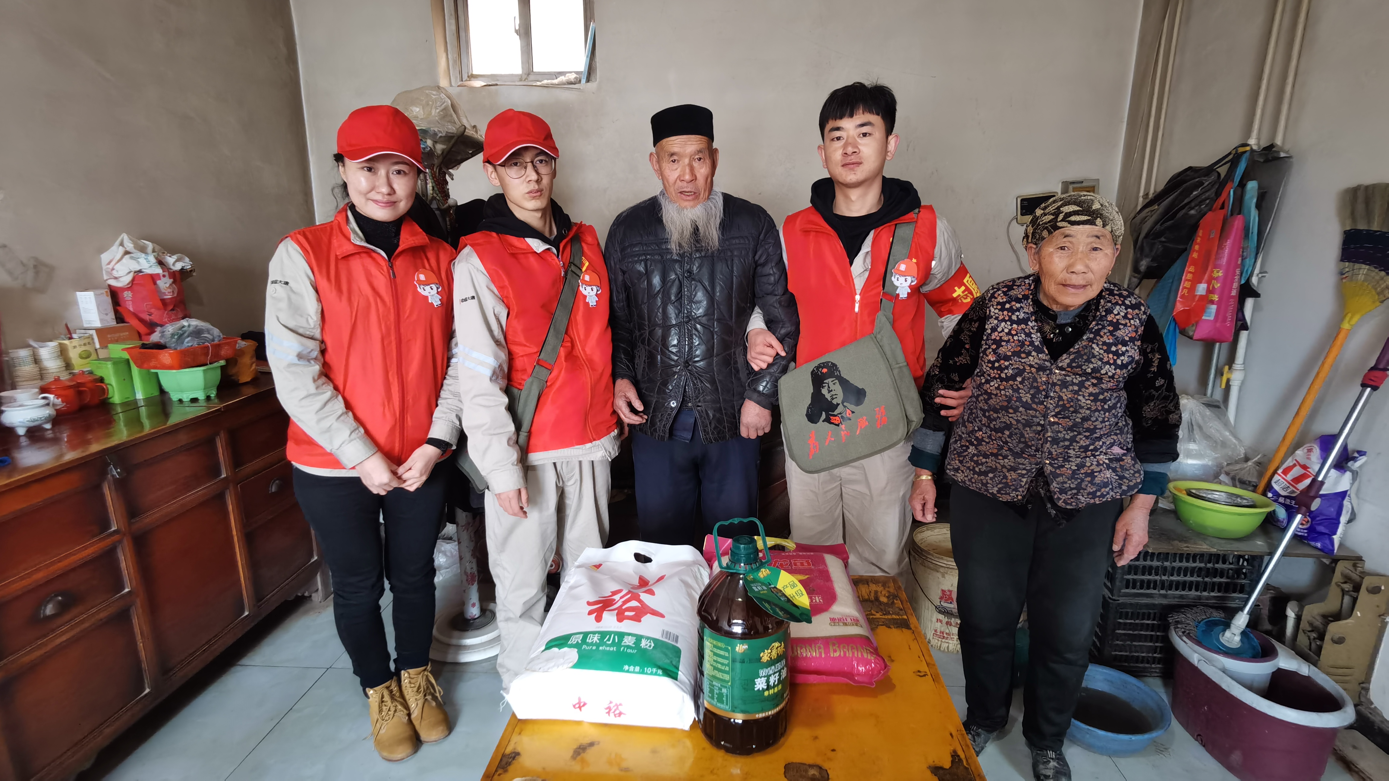 志愿者们带着米面油等慰问品走访慰问