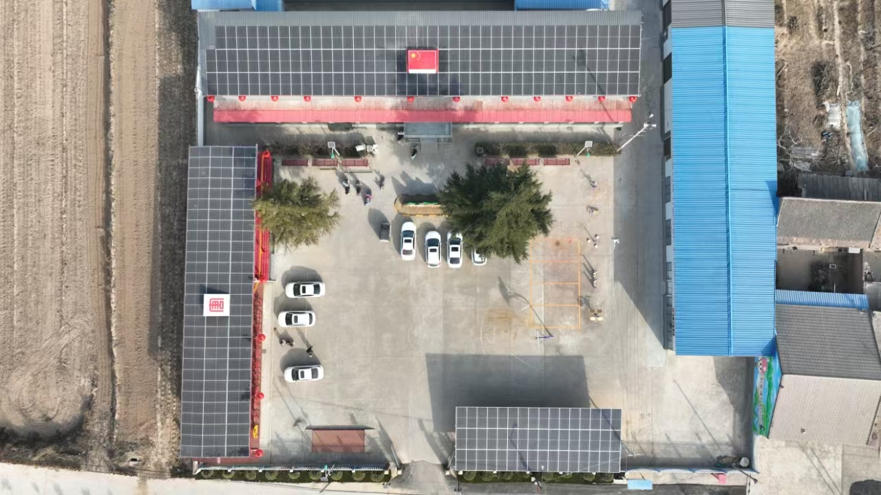 走进和家楼村村部,一排排深蓝色的单晶硅组件板在日光的照射下闪闪发光,格外耀眼。分布式光伏和智能充电桩缓解周边群众充电压力,方便群众“绿色”出行。光伏板中央将中国红、大唐红元素融入项目中,嵌入国旗和唐标,点缀大红灯笼、中式栏杆等中国风传统风格,绘就一幅美丽乡村新画卷。