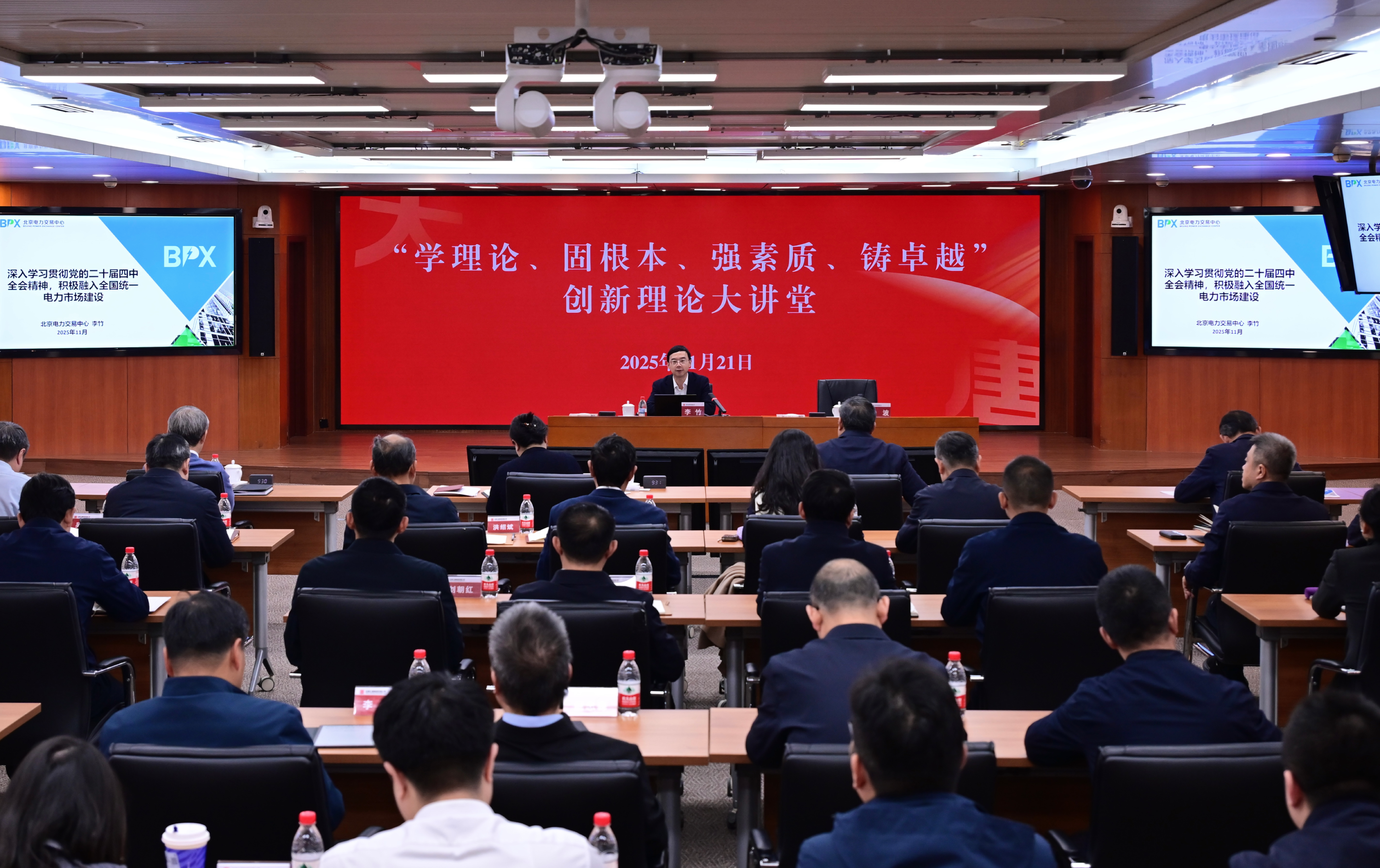 11月21日,bw必威西汉姆联官方网站集团有限公司“学理论、固根本、强素质、铸卓越”创新理论大讲堂再度开讲,邀请北京电力交易中心有限公司副总经理、能源行业电力市场技术标准委员会副主任委员李竹作《深入学习贯彻党的二十届四中全会精神,积极融入全国统一电力市场建设》专题讲座。集团公司董事、党组副书记余波主持讲座,集团公司领导王瑛、曲波、陶云鹏、苟伟参加讲座。