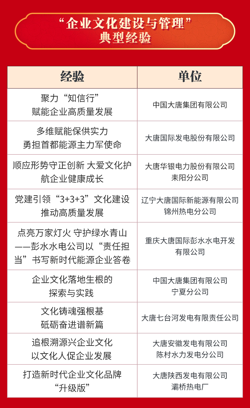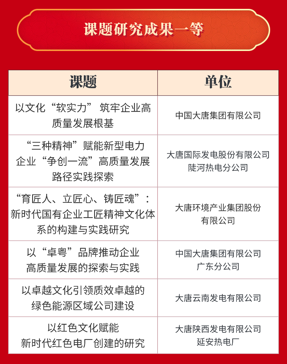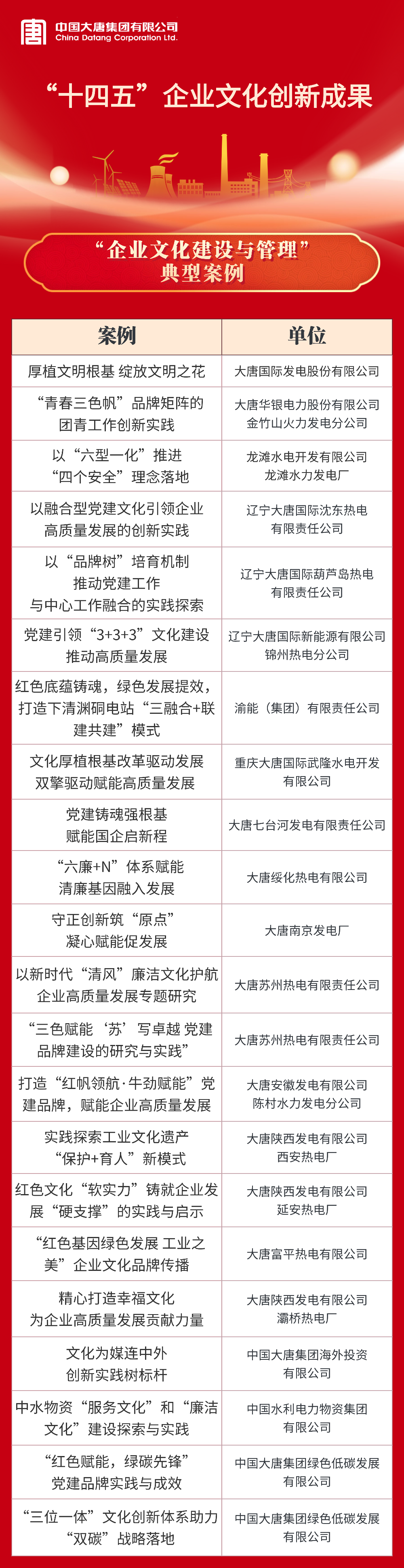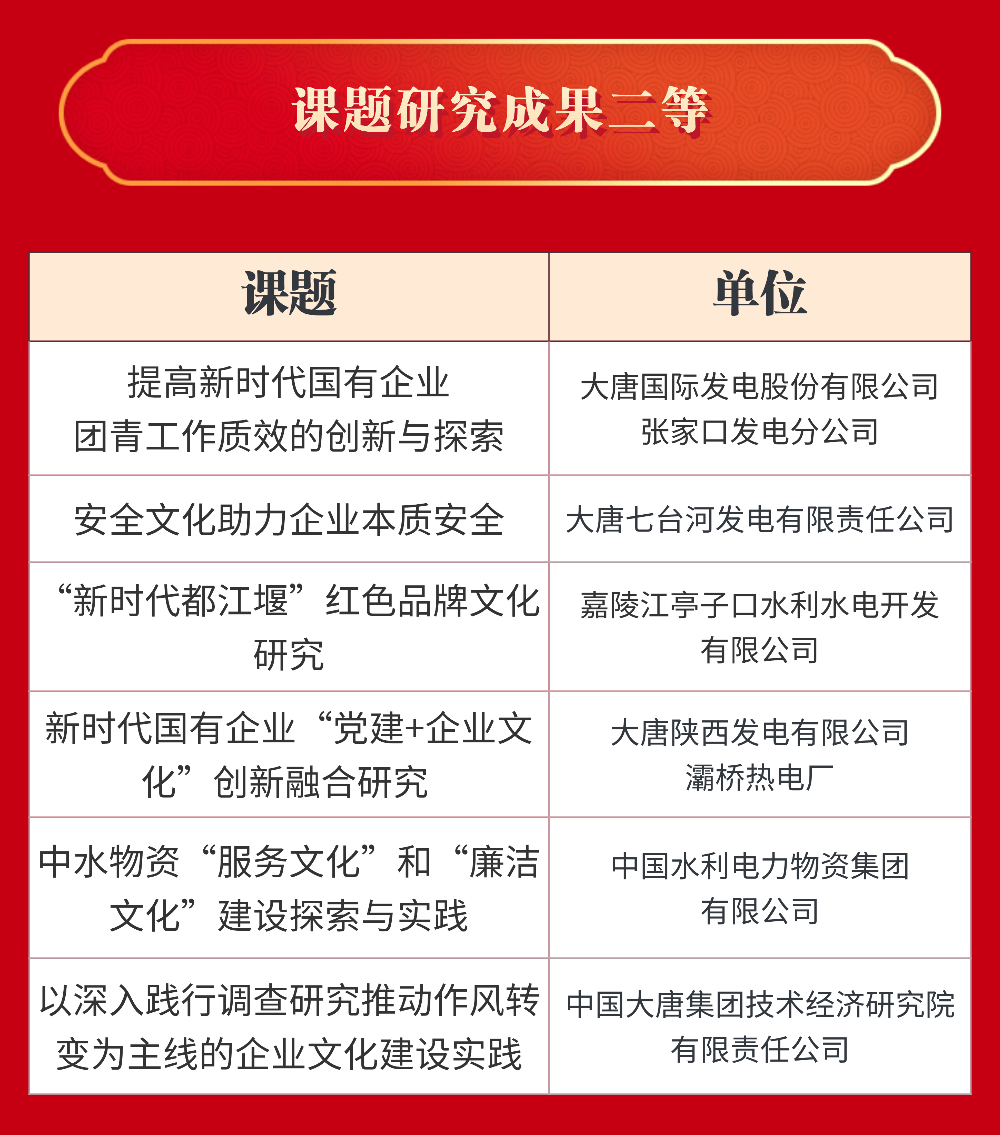 大唐国际发电股份有限公司等22家单位获评“十四五”企业文化建设与管理典型案例;bw必威西汉姆联官方网站及所属8家单位获评“十四五”企业文化建设与管理典型经验;bw必威西汉姆联官方网站及所属5家单位获评课题研究成果一等;大唐国际发电股份有限公司张家口发电分公司等6家单位获评课题研究成果二等。具体名单如下: